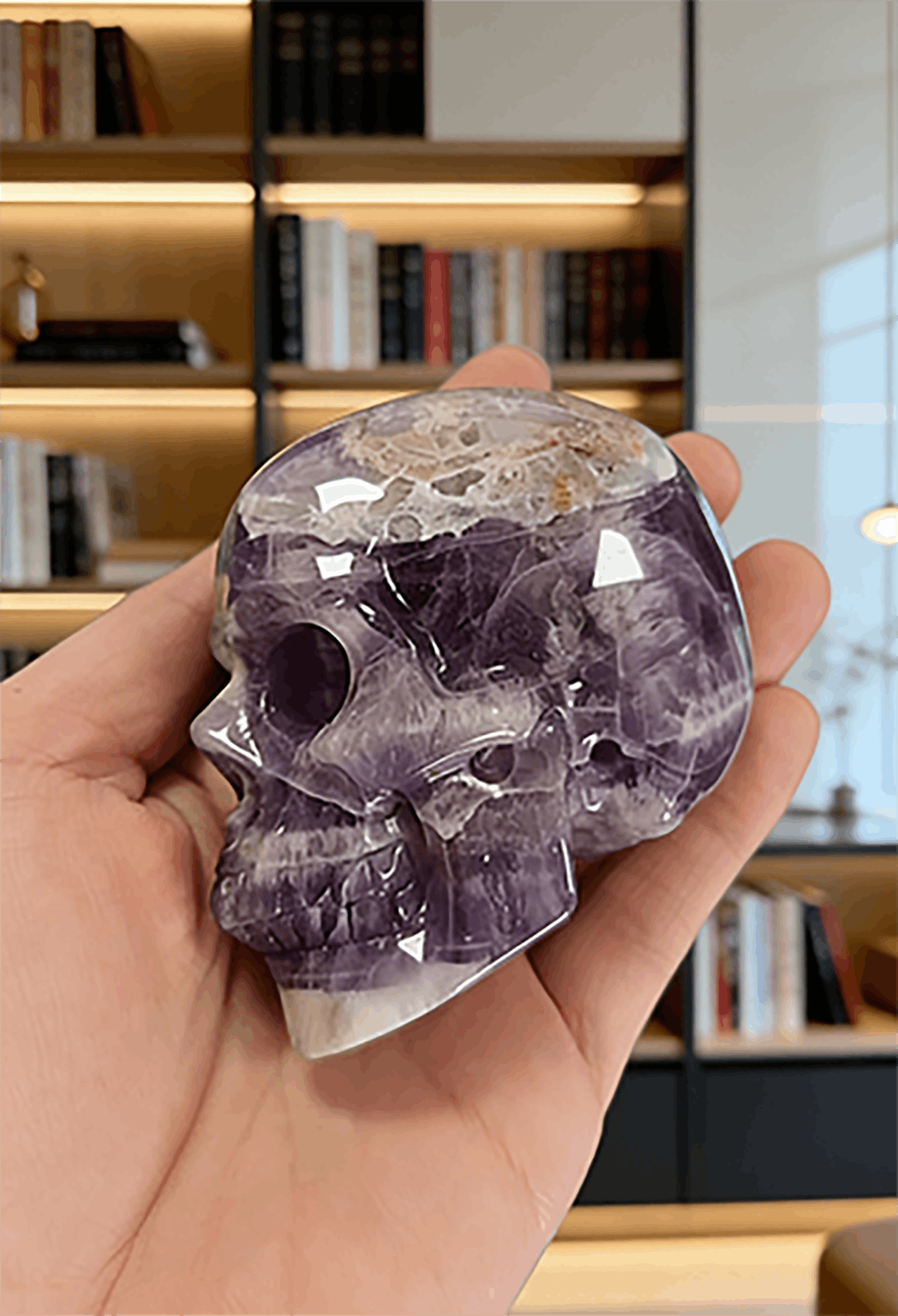 The skull is an ancient symbol of wisdom and life’s cycles. Amethyst, the 'Stone of Wisdom,' carries serene, high-frequency energy that bridges higher realms. Sculpted into a skull, it becomes a silent guide, calming the mind, revealing inner truths, and inspiring deep insight.