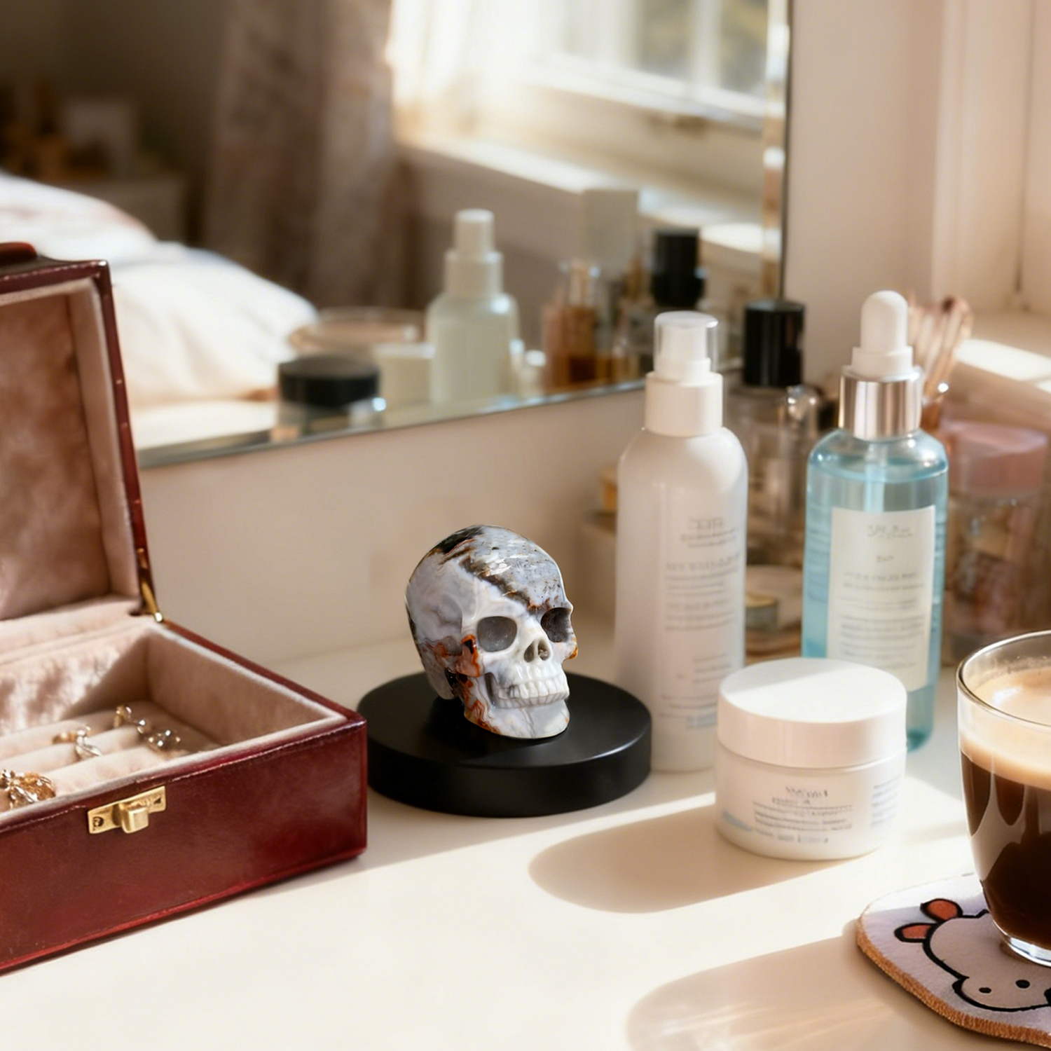 This Red Crazy Lace Agate Skull guards your laughter — the fire of passion, the courage to smile through challenges.