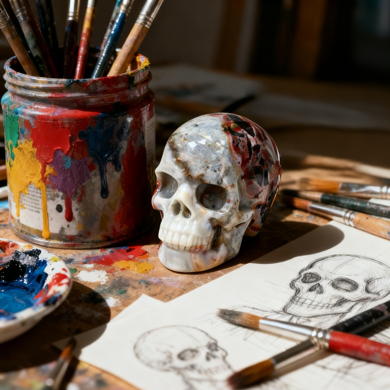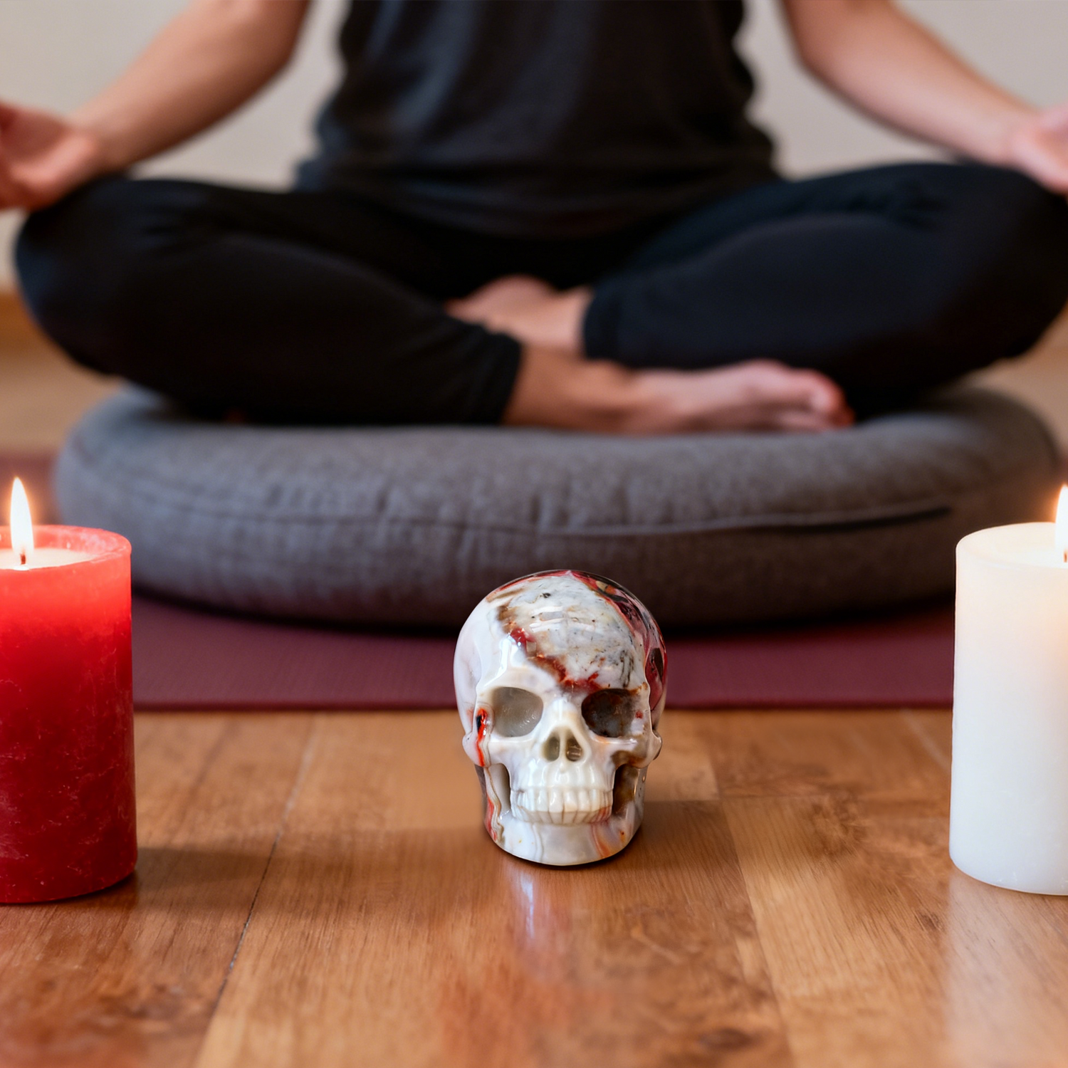 Red Crazy Lace Agate, the “Stone of Laughter,” embodies joy, vitality, and celebration. Its vivid patterns mirror the movement of life itself. Carved into a skull, it becomes a radiant talisman — urging you to live fully, love deeply, and laugh freely.