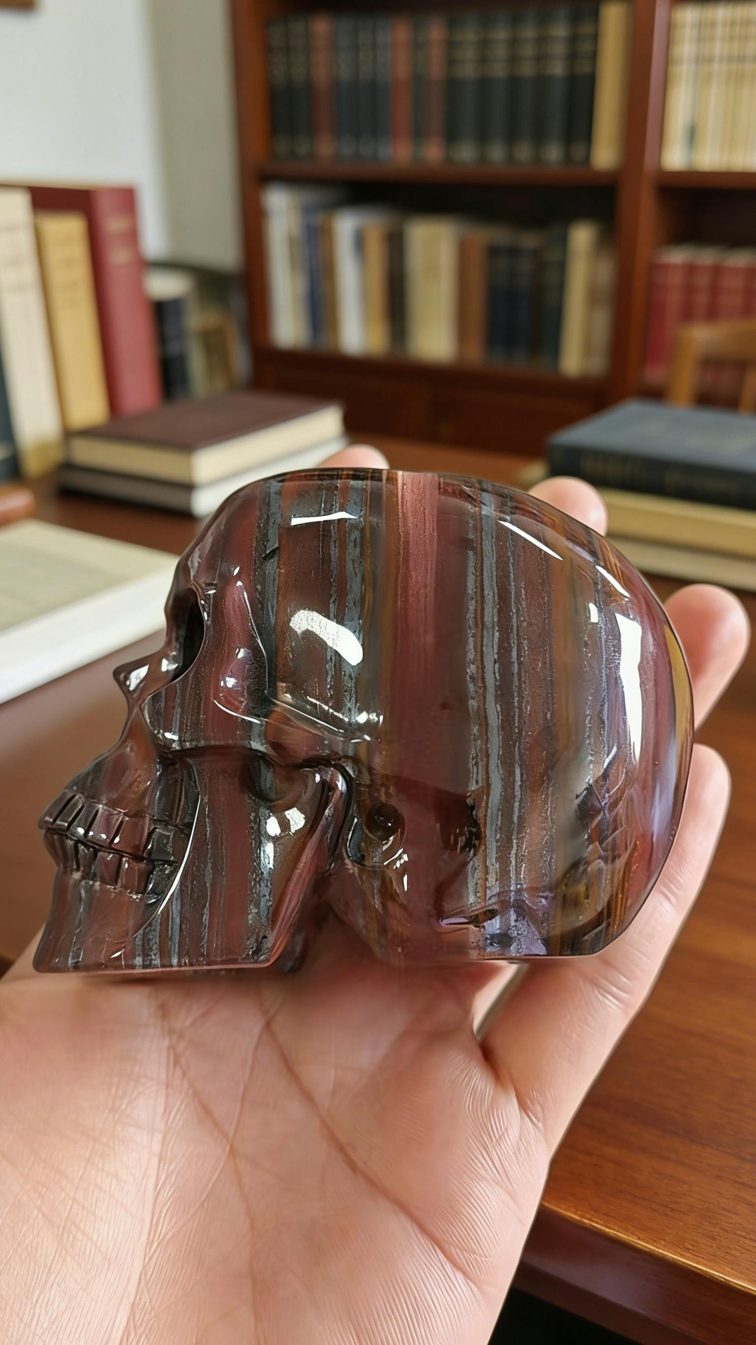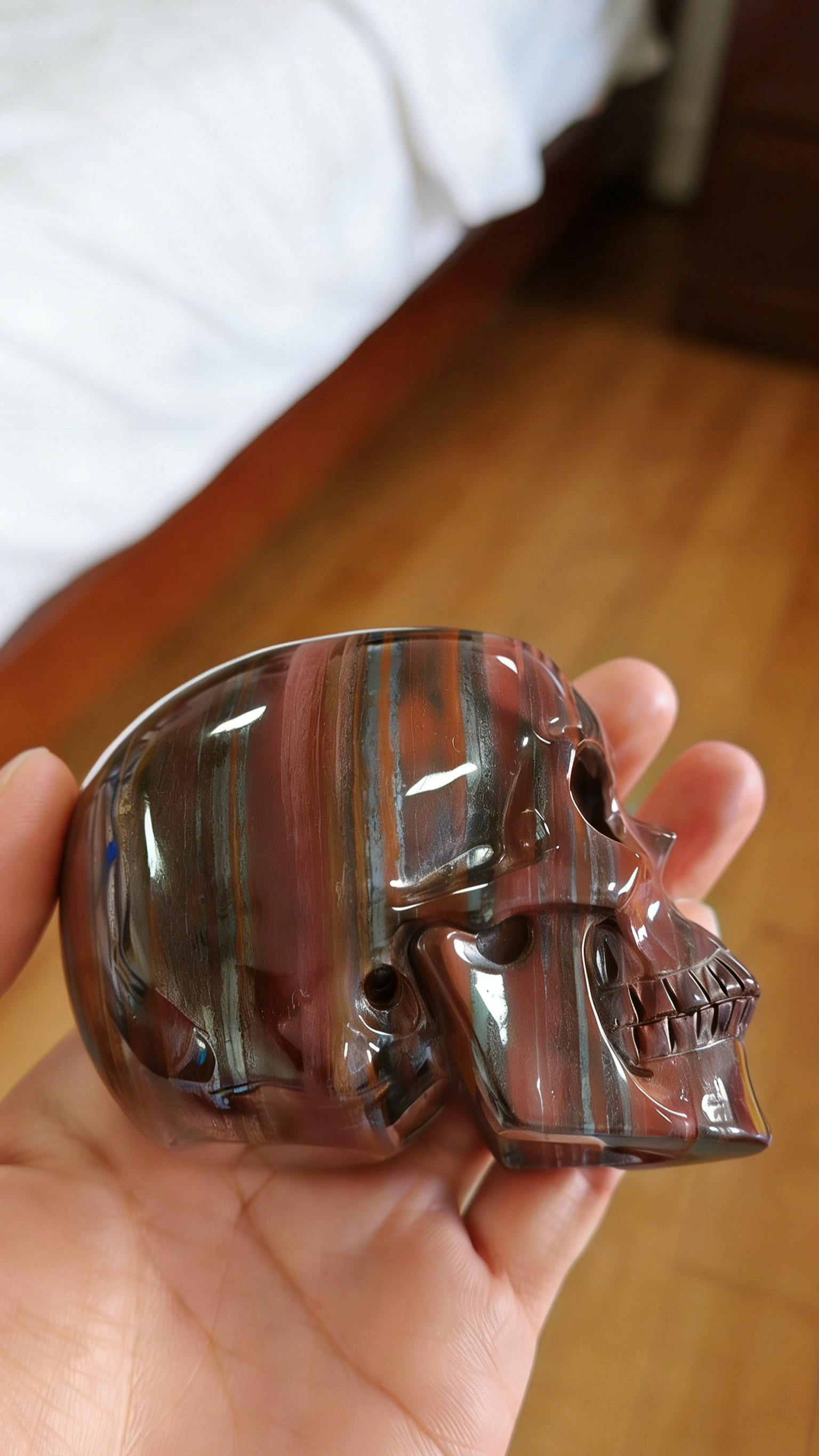 This handcrafted Tiger Iron crystal skull is a rare natural fusion of Tiger’s Eye, Hematite, and Red Jasper. Each mineral brings its own powerful energy, and together they create a stone of strength, vitality, and protection. Every skull is hand-carved and polished, making it a truly unique addition to your crystal collection or sacred space.