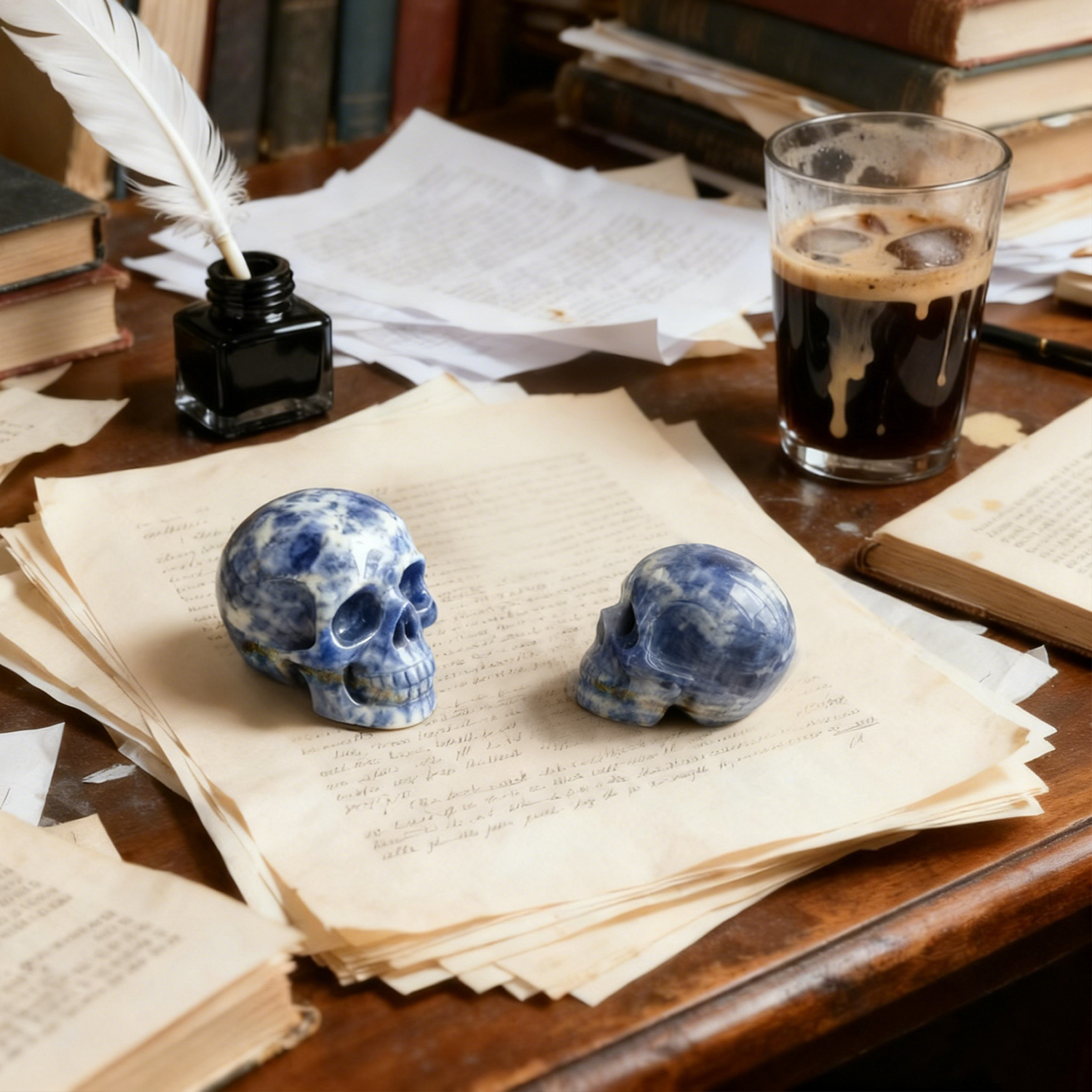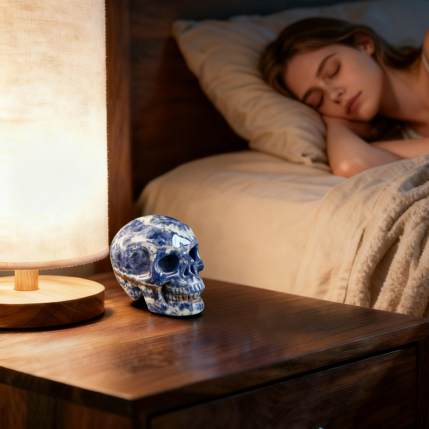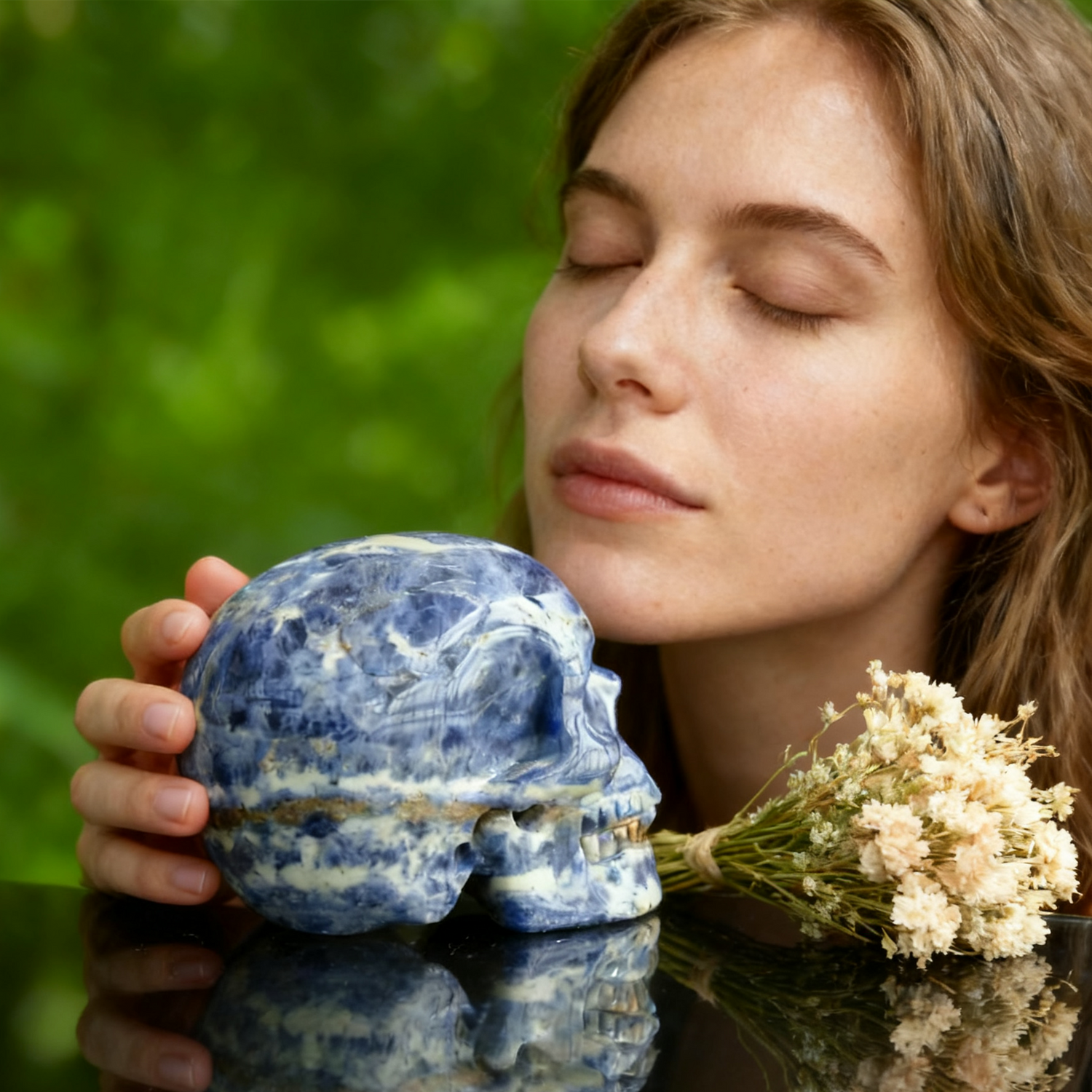 Deep within the mountains of Sichuan lies Blue Lace Agate — a natural tapestry of swirling blue and white, like ancient rivers flowing under starry skies. Sculpted into a skull, it becomes more than art; it’s a key to introspection, serenity, and profound wisdom.