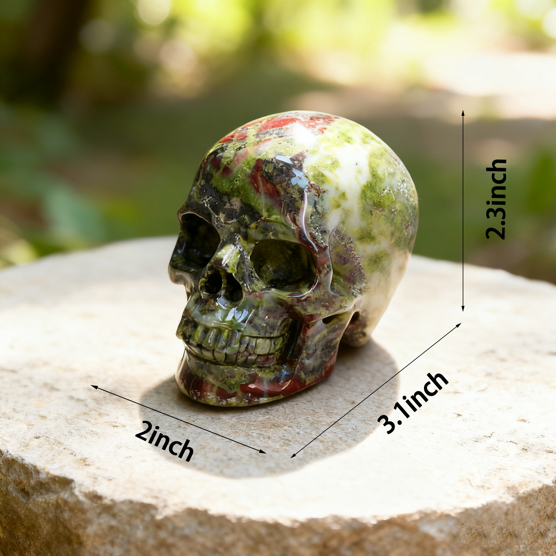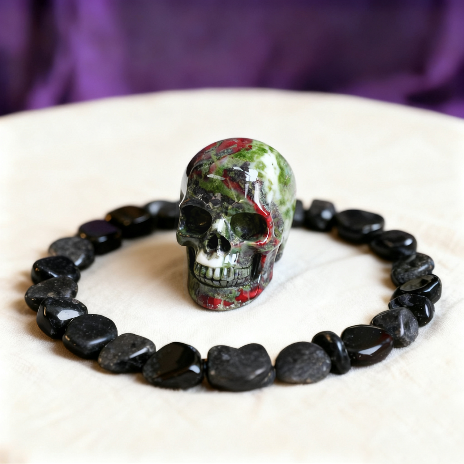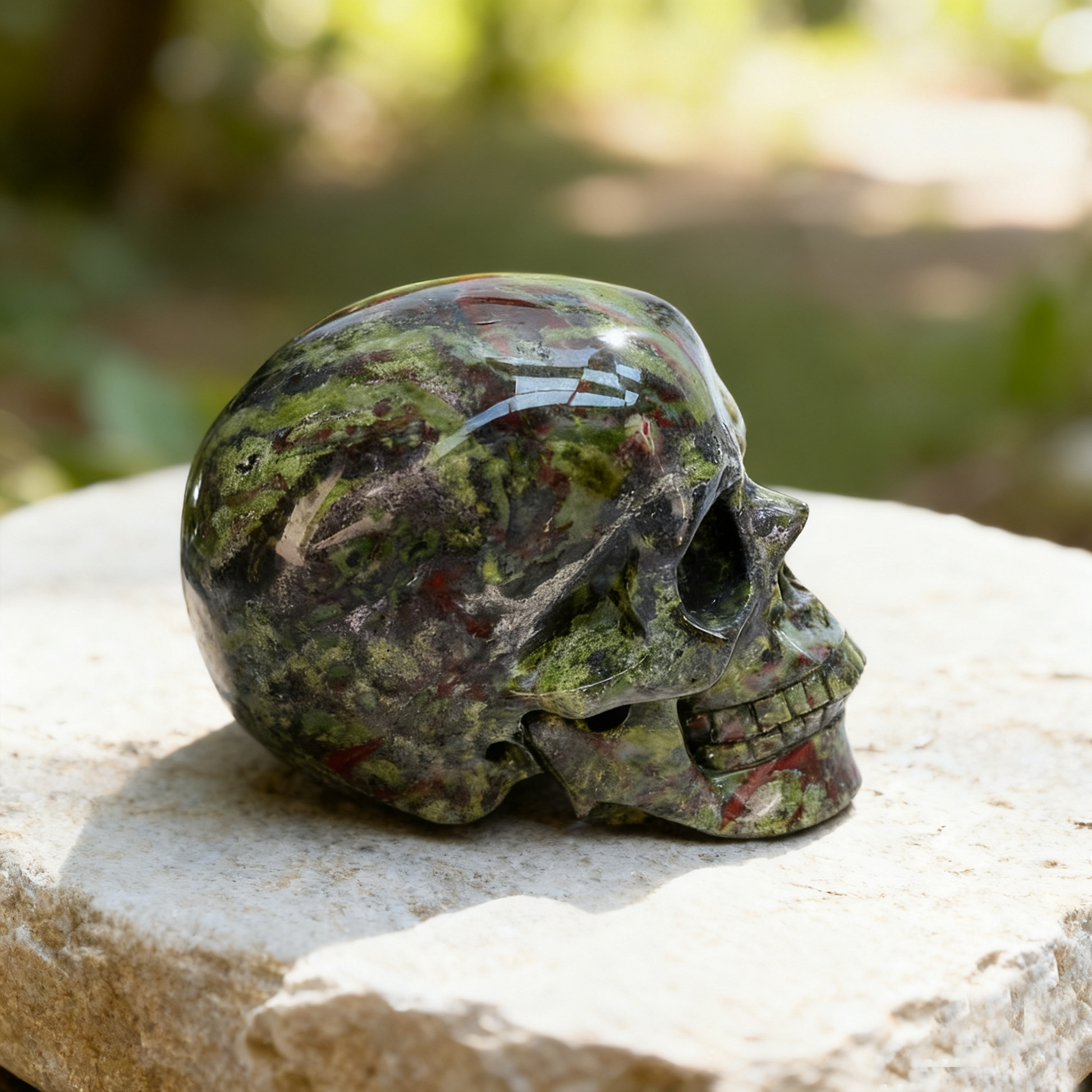 The skull is the ultimate symbol of fearlessness, revealing life’s raw power through transformation. Dragon Bloodstone, a legendary crystal born from mythical battles — dragon’s blood merging with sacred green jade — carries both primal courage (red) and fertile life force (green).