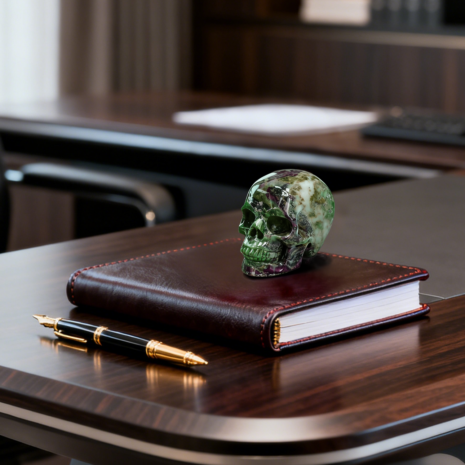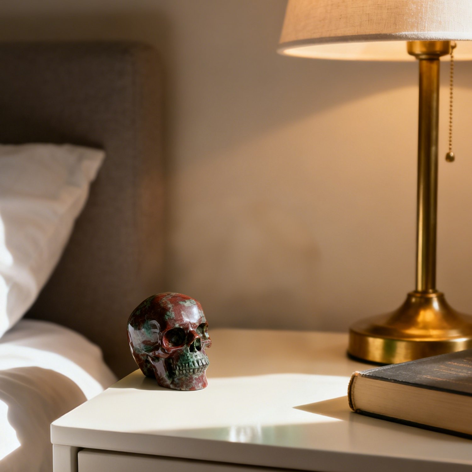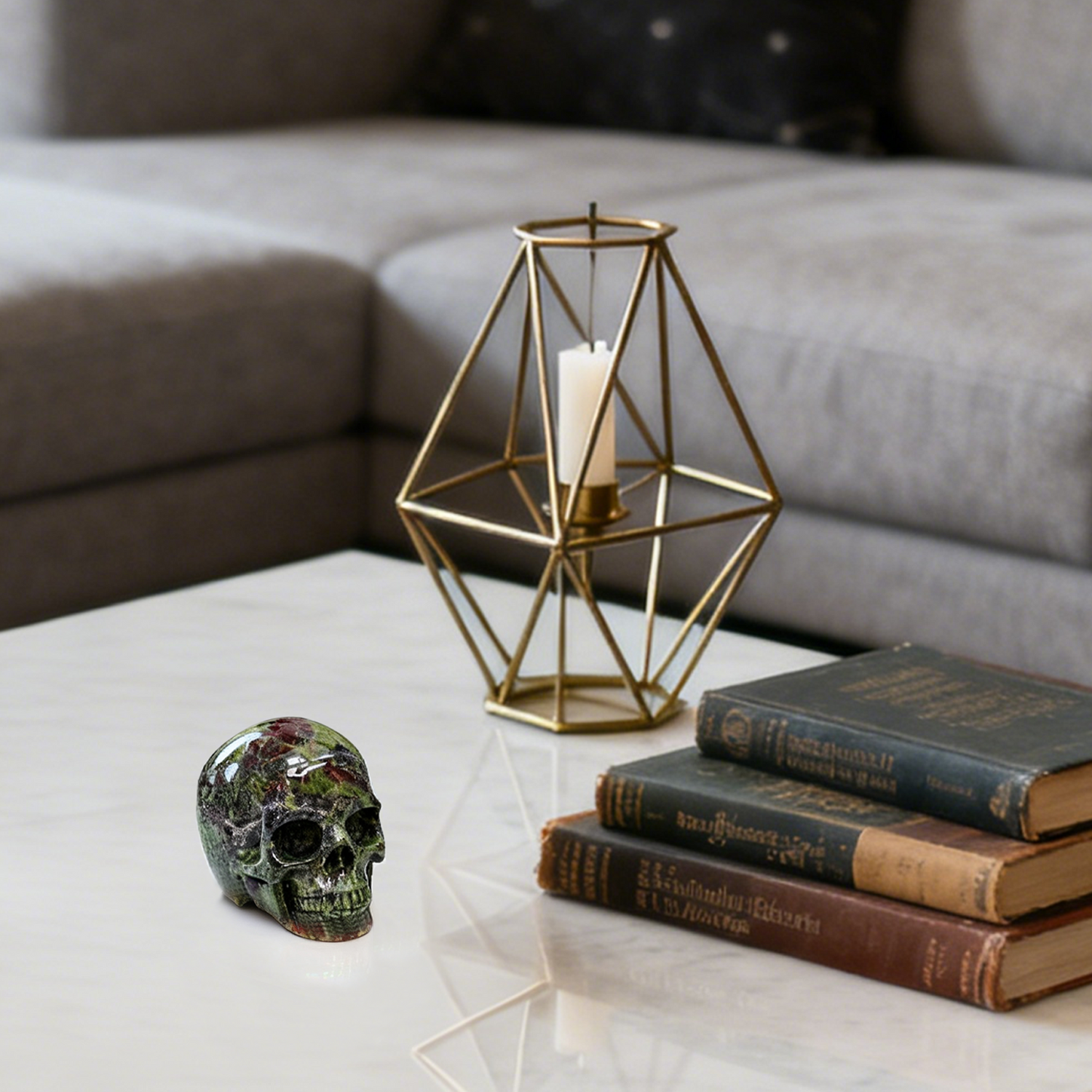 The skull is the ultimate symbol of fearlessness, revealing life’s raw power through transformation. Dragon Bloodstone, a legendary crystal born from mythical battles — dragon’s blood merging with sacred green jade — carries both primal courage (red) and fertile life force (green).