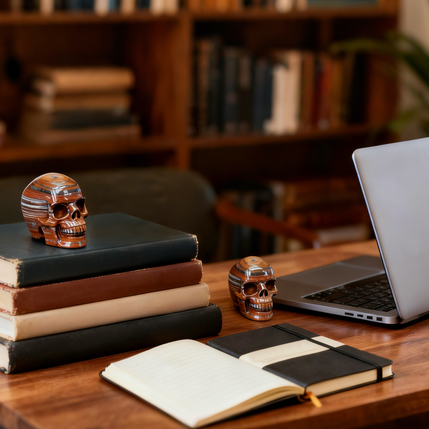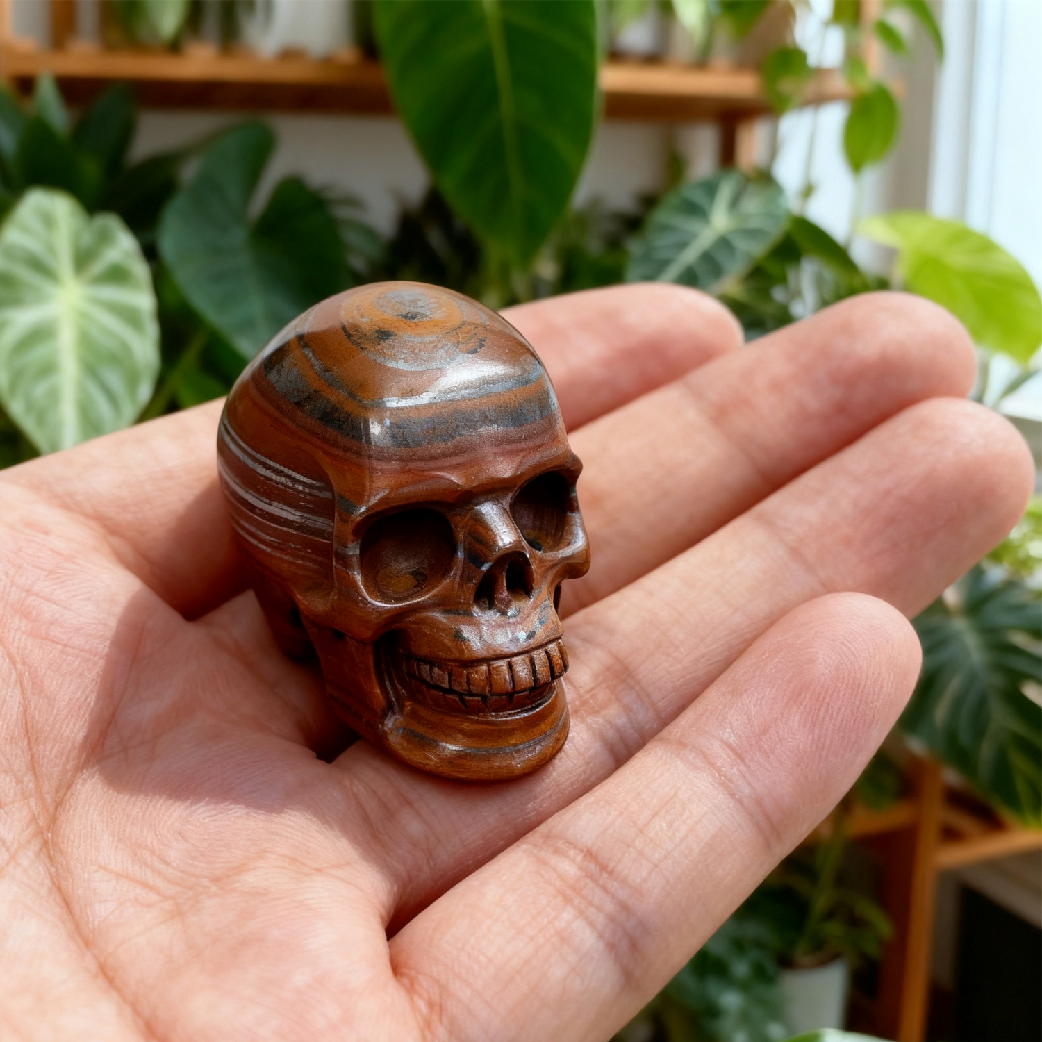 This handcrafted Tiger Iron crystal skull is a rare natural fusion of Tiger’s Eye, Hematite, and Red Jasper. Each mineral brings its own powerful energy, and together they create a stone of strength, vitality, and protection. Every skull is hand-carved and polished, making it a truly unique addition to your crystal collection or sacred space.