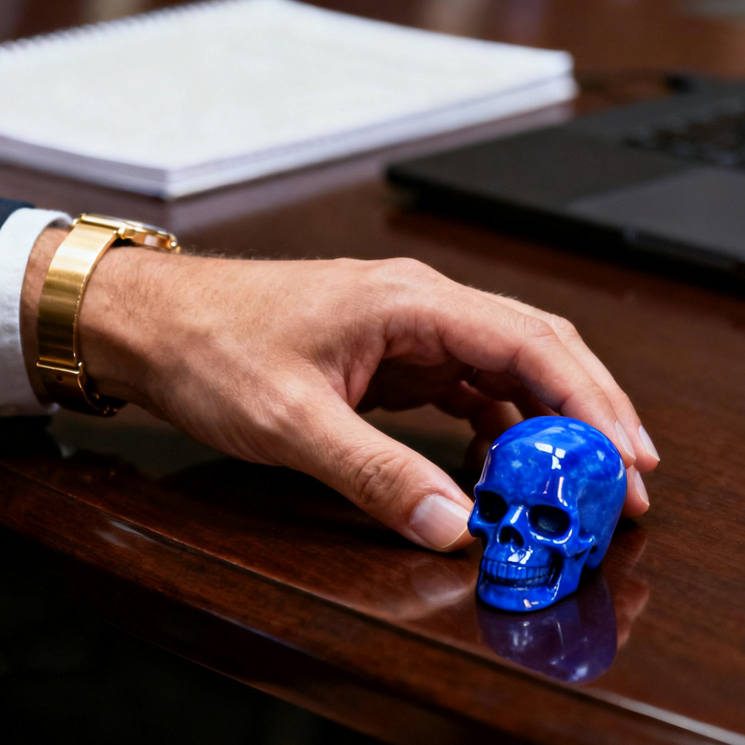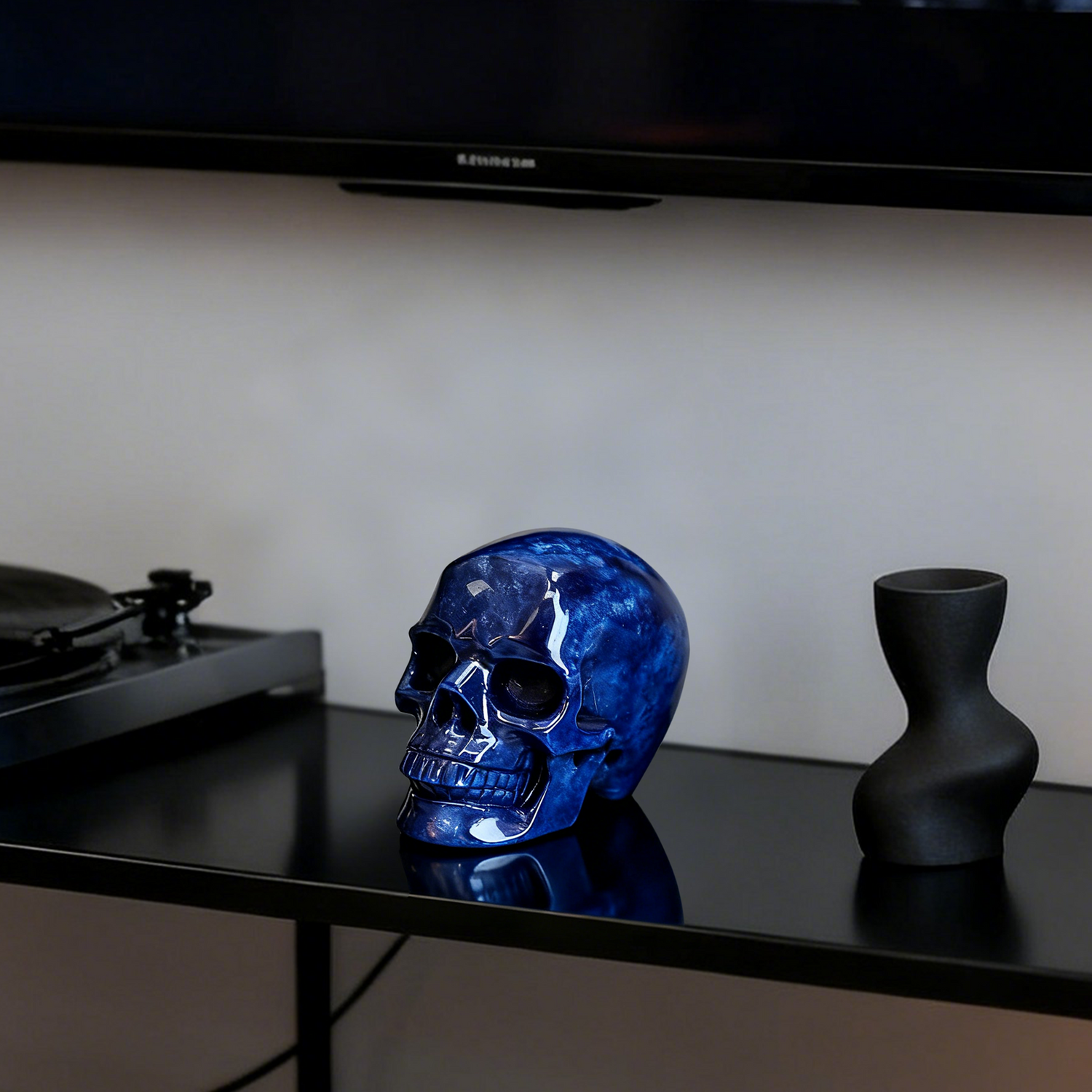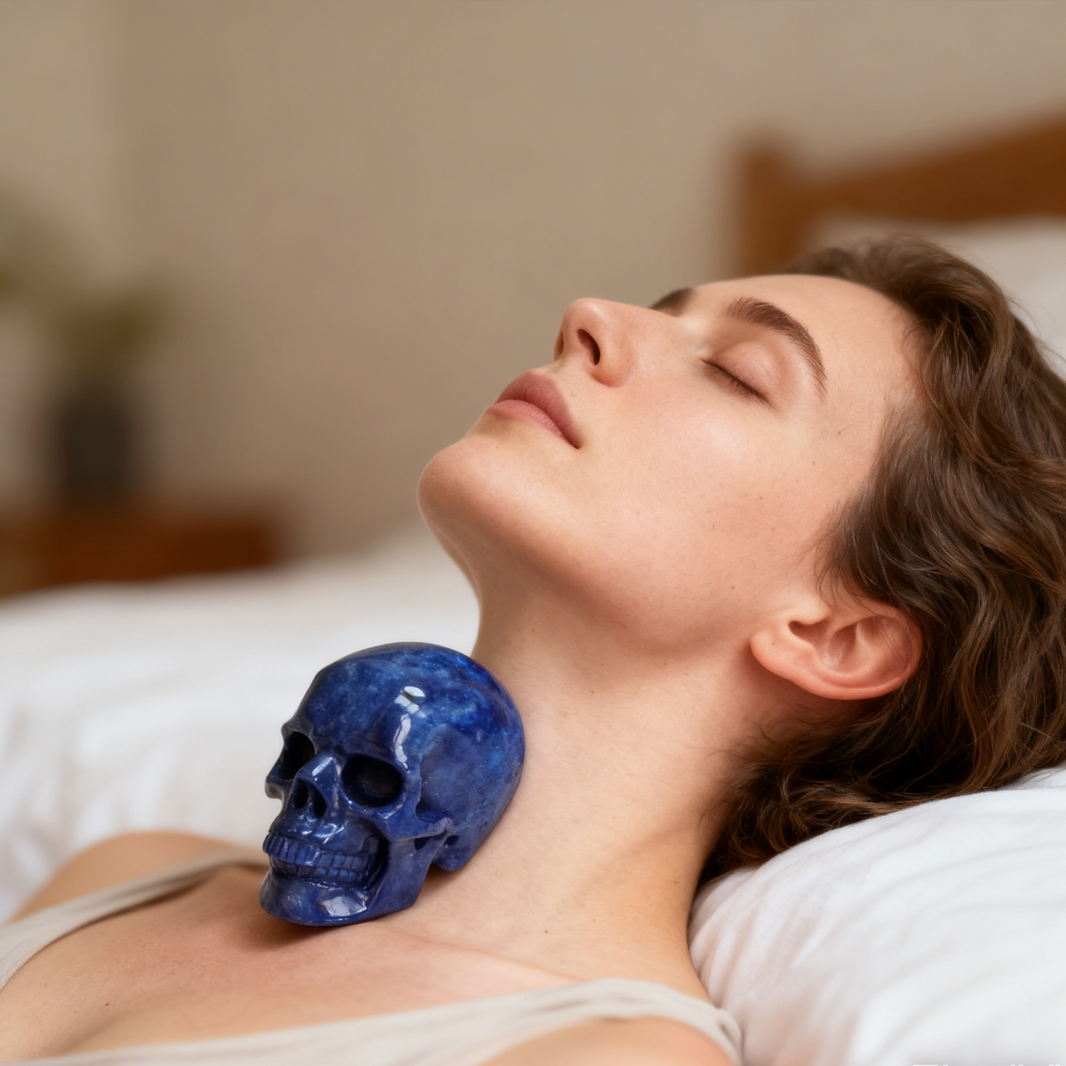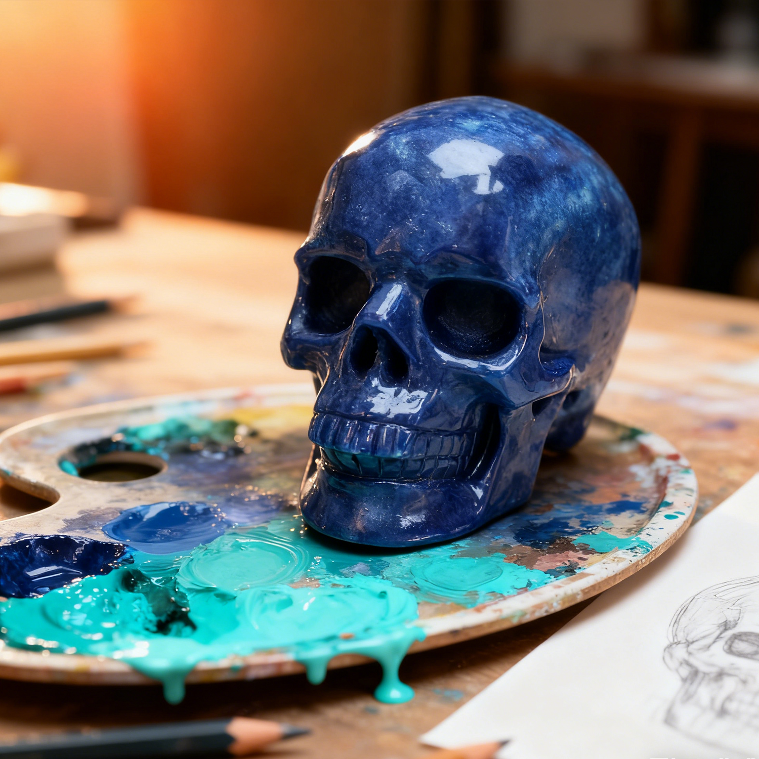 Blue Aventurine, a rare treasure from the heart of the Earth, carries gentle ripples of blue-gray and sparkling mica, as if dawn’s quiet sky is captured within stone. Sculpted into a skull, it becomes the “Calm Communicator” — a guide to inner peace and sincere expression.