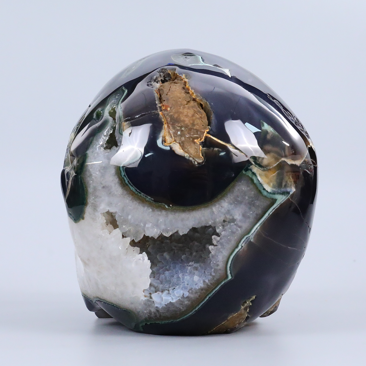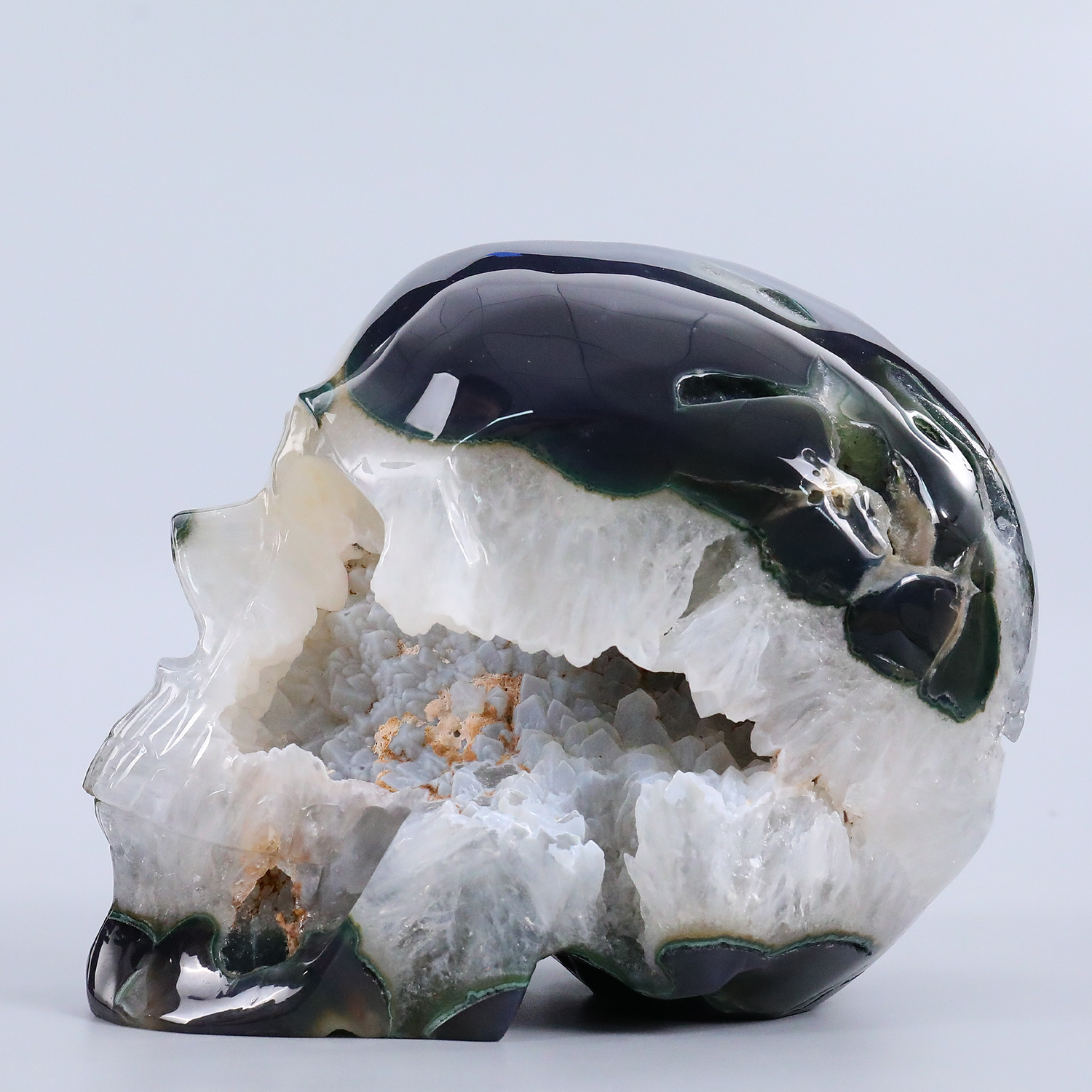 In crystal lore, crystal skulls are known as containers of knowledge and wisdom, aiding in deep meditation, enhancing intuition, and fostering spiritual awakening. The Agate provides grounding and protective energy, while the internal geode acts as a powerful amplifier, making this skull an ultimate tool for energy work.